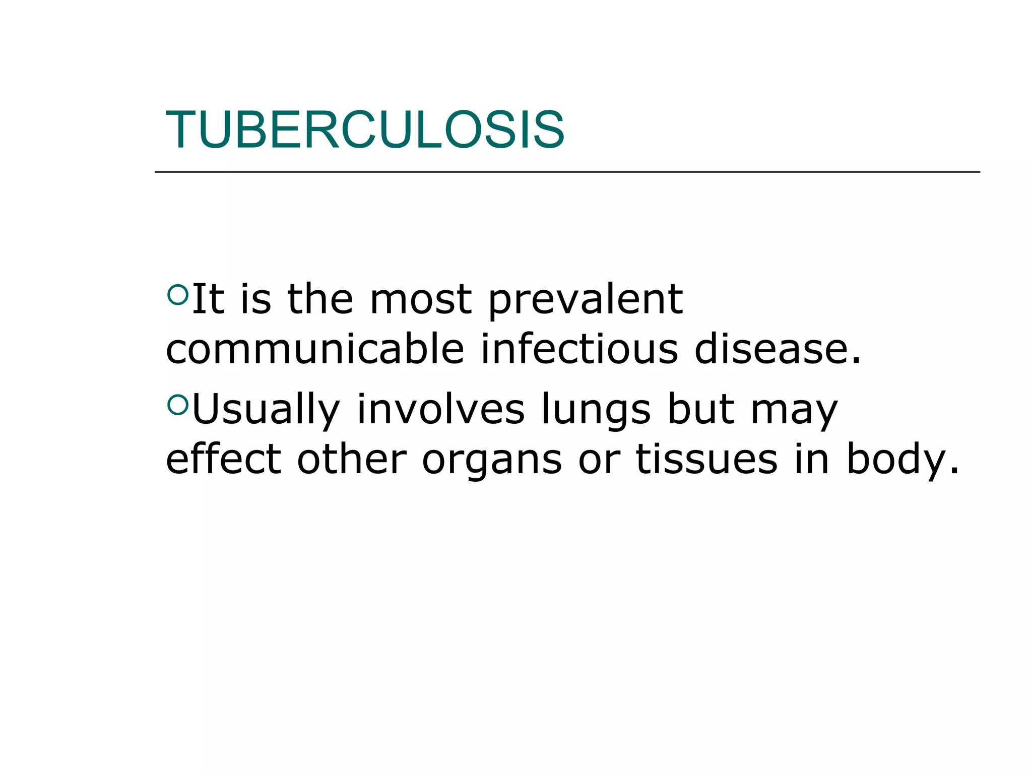 Tuberculosis is a highly infectious disease that is usually caused by the Mycobacterium tuberculosis bacterium. It most commonly affects the lungs through airborne droplets but can impact other organs. Common symptoms include weight loss, cough, fever and night sweats. Diagnosis involves physical exams, lab tests, imaging and tuberculin skin tests. Treatment requires a multi-drug regimen over an intensive and continuation phase to cure the infection and prevent transmission to others. Directly Observed Therapy Short Course aims to effectively treat TB through detection, regular drug supply and outcome reporting over a standard six month period.