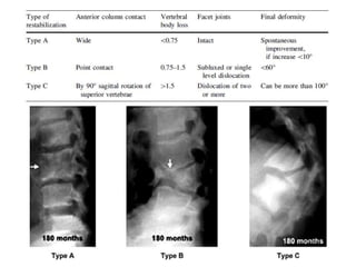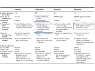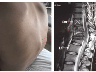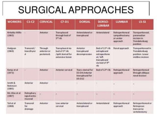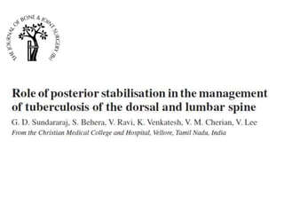The document discusses spinal tuberculosis, also known as Pott's disease, first described by Sir Percival Pott in 1779. It highlights the epidemiology, clinical features, mechanisms of spread, radiological appearances, diagnosis, and treatment strategies for spinal tuberculosis, emphasizing the importance of early intervention to prevent severe complications such as kyphosis and paralysis. Various factors contributing to the disease progression and outcomes in adults and children are also addressed, along with surgical management approaches.