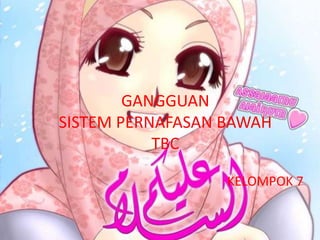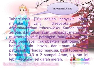 Tuberkulosis (TB) adalah penyakit infeksi menular yang disebabkan oleh Mycobacterium tuberculosis, yang dapat mengakibatkan gangguan pada sistem pernapasan, bronkitis, dan masalah pencernaan. Individu berisiko tinggi untuk terinfeksi meliputi mereka yang memiliki sistem imun lemah, masyarakat miskin, dan petugas kesehatan. Gejala utama TB termasuk batuk, sesak napas, dan batuk darah, yang dapat didiagnosis melalui pemeriksaan laboratorium dan radiologi.