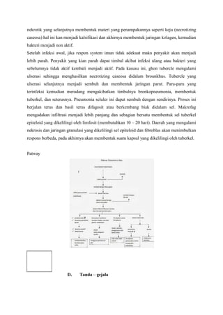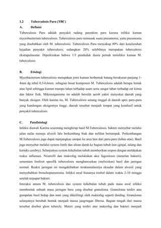 1. Tuberkulosis paru adalah penyakit radang paru yang disebabkan oleh infeksi bakteri Mycobacterium tuberculosis. Bakteri ini menyerang paru-paru dan menyebabkan gejala seperti batuk berdarah dan demam. 2. Diagnosa didasarkan pada pemeriksaan fisik, hasil laboratorium seperti tes tuberkulin dan röntgen dada, serta riwayat pasien. 3. Pengobatan meliputi antibiotik anti-TB selama berbulan-bulan untuk membunuh bak