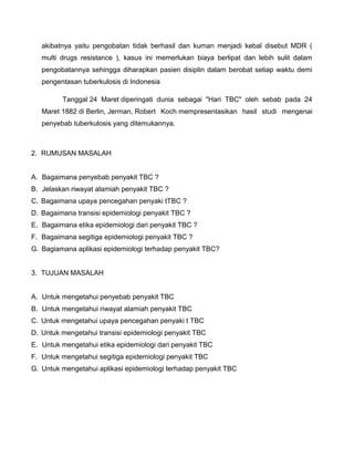 Dokumen tersebut membahas tentang penyakit tuberkulosis (TBC), termasuk penyebabnya (bakteri Mycobacterium tuberculosis), gejala klinisnya, dan faktor-faktor yang berkontribusi terhadap penularannya. TBC merupakan masalah kesehatan global yang sering menyerang paru-paru dan dapat menular dari orang ke orang melalui udara yang tercemar. Pengobatan yang tepat dan disiplin diperlukan untuk mencegah penularan le