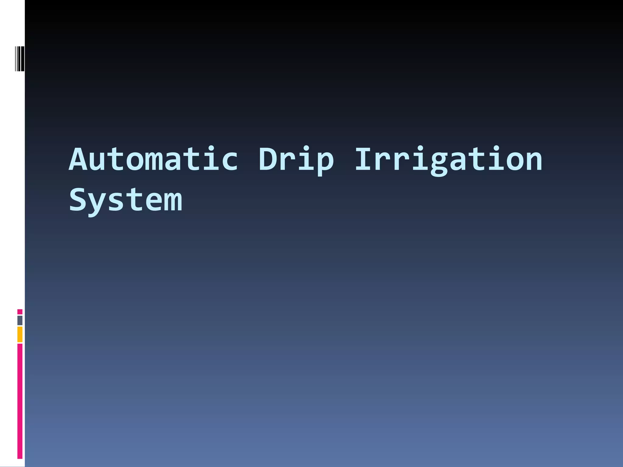The document describes an automatic drip irrigation system that was implemented on a 30 acre farm. The system uses sensors to monitor soil moisture and a battery backup to power the pumps during periods without electricity. It reduced water usage from 100,000 liters to 60,000 liters daily and improved yields. The system aims to efficiently manage water resources through precise automated control and monitoring of soil moisture levels.