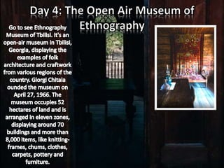 The document discusses the Mtatsminda Pantheon in Tbilisi, Georgia. It is a necropolis located in the churchyard of St. David's Church where many prominent Georgians are buried, including writers, artists, and national heroes. The pantheon was officially established in 1929 and the first famous individuals buried there were Russian writer Alexander Griboyedov and his Georgian wife Nino Chavchavadze. It invites the reader to visit this site dedicated to honoring Georgia's most influential historical figures.