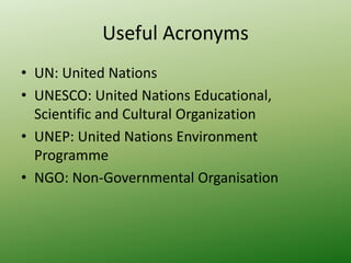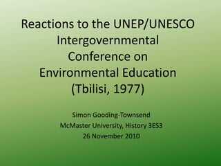 The UNEP/UNESCO Intergovernmental Conference on Environmental Education was held in Tbilisi, Georgia in October 1977. It was organized by UNESCO and attended by representatives from 66 UNESCO member states, 8 UN programs, 3 intergovernmental agencies, and 20 NGOs. The conference helped establish environmental education as a field and emphasized increasing awareness of environmental issues through formal and non-formal education.