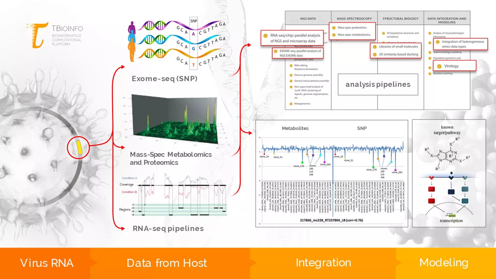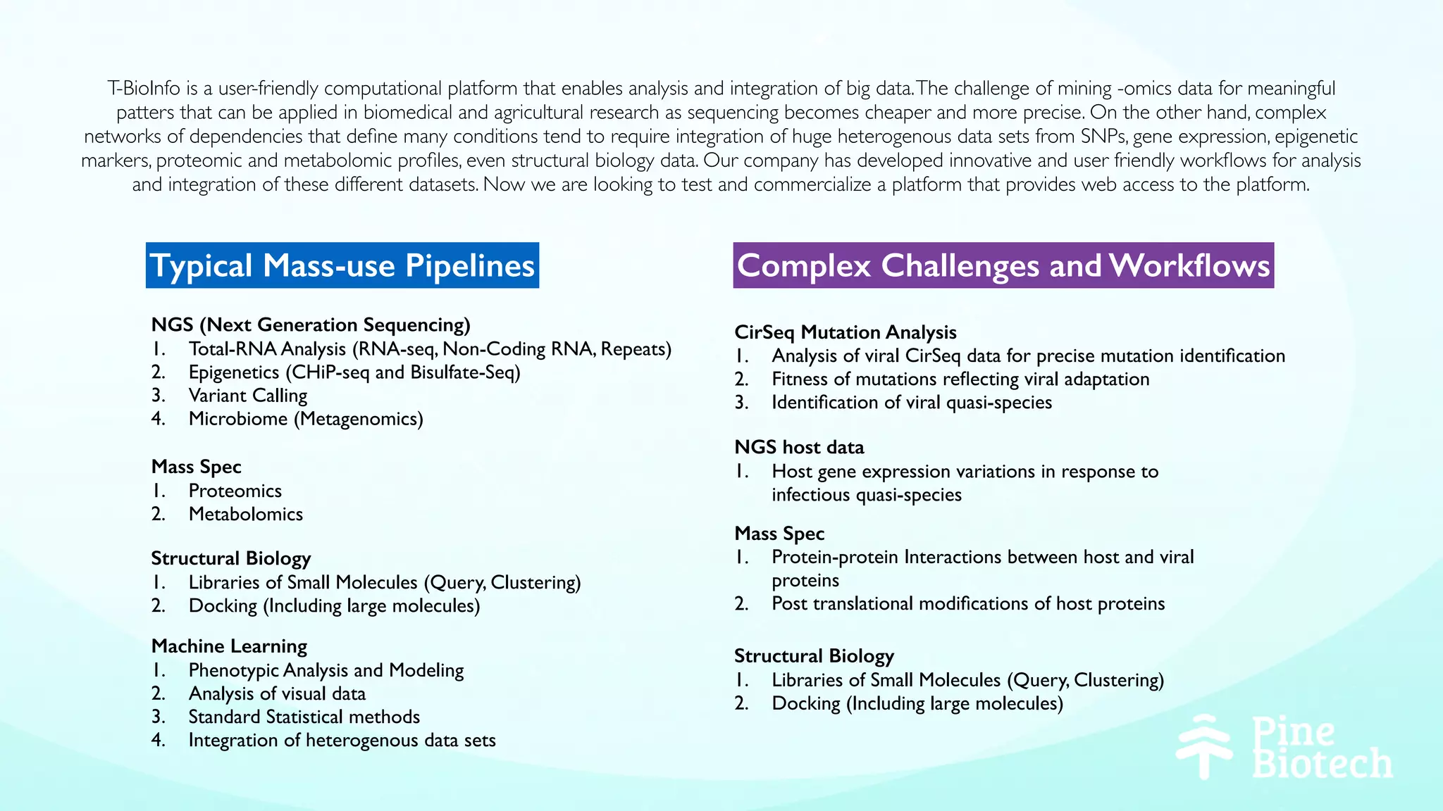 The document discusses the challenges and workflows of various mass-use pipelines in bioinformatics, particularly focusing on next-generation sequencing (NGS) analysis, epigenetics, and machine learning applications. It introduces t-bioinfo, a user-friendly computational platform designed for the integration and analysis of diverse biological data types, and outlines innovative workflows for RNA-seq, epigenetic analysis, and virology pipelines. Additionally, it highlights collaborations and commercialization efforts with research centers for drug discovery and analysis of small molecules.