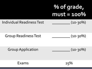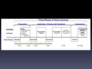 The document discusses the key aspects of team-based learning (TBL), including that groups consist of 5-7 diverse students who work together over a semester or block. Faculty organize the teams. The Readiness Assurance Process (RAP) is used and involves individual and group tests over assigned readings with appeals and clarification. Teams then work through application exercises together by addressing a significant problem, same problem, specific choice, and simultaneous reporting. Peer evaluations are used as a grade modifier. TBL requires power sharing between faculty and students and additional pre-class reading.