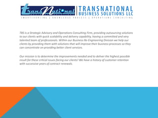 The Business Re-Engineering Division of TBS helps clients improve their business processes so they can focus on providing better client services. They determine what improvements are needed and deliver high results for critical issues facing clients. TBS has a history of customer retention through contract renewals. They provide outsourcing solutions with scalable and quick delivery, using a committed team of professionals.