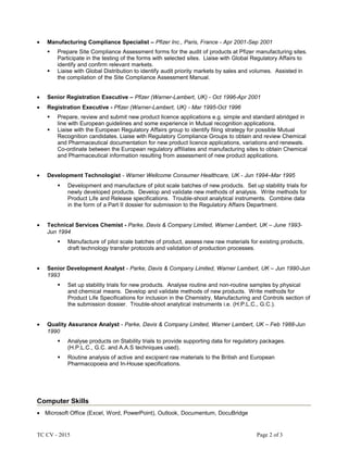 This document is a resume for Terry Chan summarizing their 26 years of experience in the pharmaceutical industry working in regulatory affairs, regulatory compliance, and analytical chemistry. They are currently seeking a new challenging opportunity to utilize their skills and contribute to a successful team. Their resume provides details on their employment history including roles at McNeil Consumer Healthcare, Pfizer Inc., and Warner Wellcome Consumer Healthcare. It also lists their computer skills and education with a BSc in Chemistry from the University of Glamorgan in the UK.