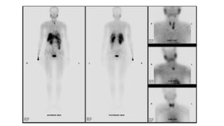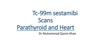 Tc-99m sestamibi is a radiopharmaceutical used for parathyroid imaging and myocardial perfusion scintigraphy, known for its uptake in metabolically active tissues. For parathyroid scans, the adult dose is 740 MBq, with imaging performed at 15 minutes and 2 hours, while myocardial perfusion scintigraphy typically uses a 400 MBq dose at rest and 1.1 GBq during stress. The technique is vital for diagnosing conditions like coronary artery disease and parathyroid adenomas, with specific imaging protocols to assess both blood flow and tissue abnormalities.