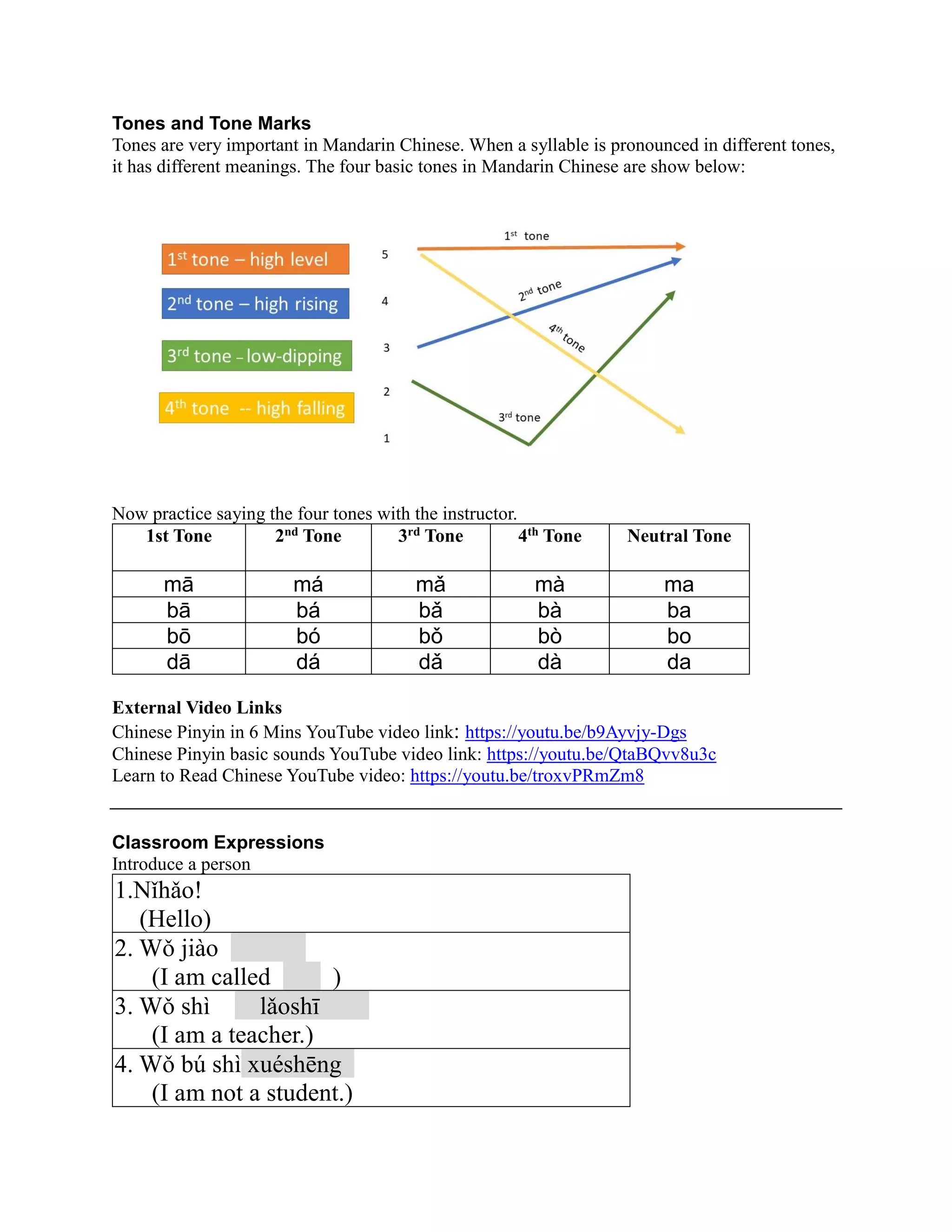 This document provides an overview of learning Chinese pronunciation and characters. It introduces the Pinyin system for representing Chinese sounds using the Latin alphabet. Key aspects of Chinese syllables and tones are explained. Examples of common radicals, stroke order rules, and classroom expressions are given to help students become familiar with basic pronunciation and characters.