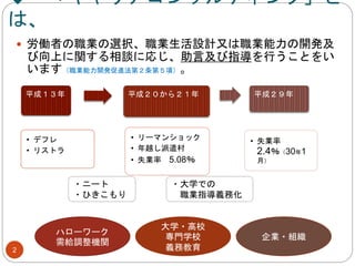 ◆ 「キャリアコンサルティング」と は、 2 労働者の職業の選択、職業生活設計又は職業能力の開発及 び向上に関する相談に応じ、助言及び指導を行うことをい います(職業能力開発促進法第2条第5項)。 平成13年 •