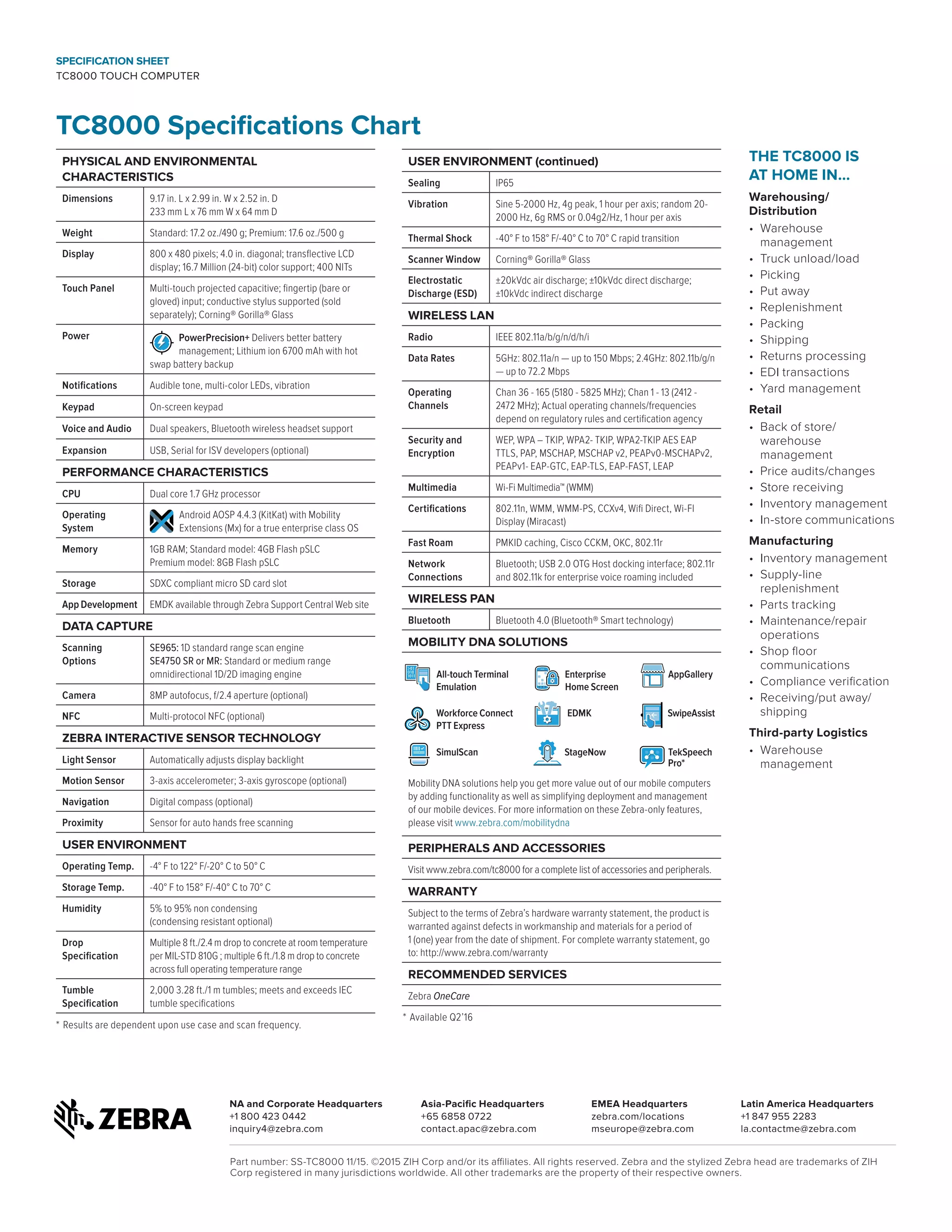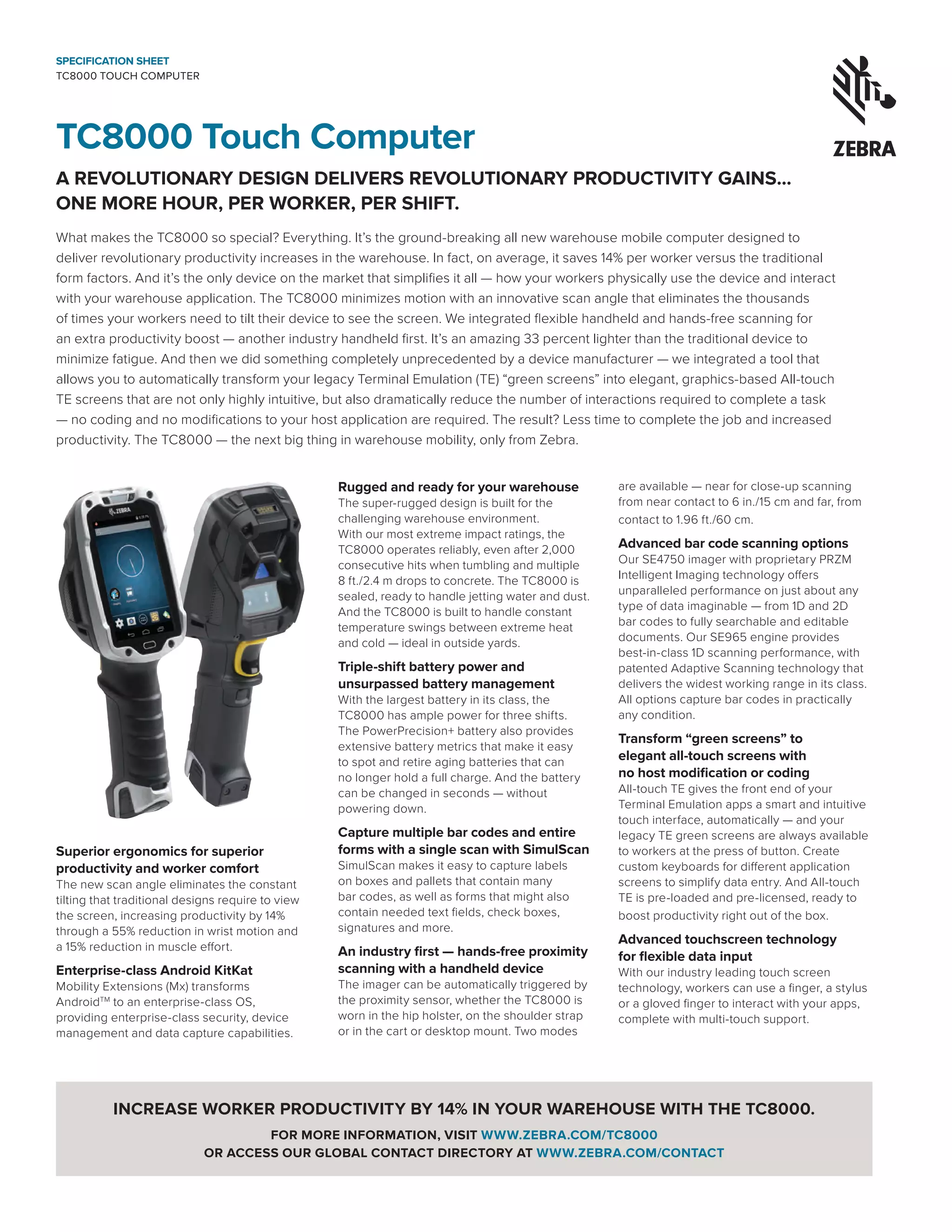 The TC8000 Touch Computer is a revolutionary new warehouse mobile device designed to increase worker productivity by 14% on average. It features an innovative scan angle that eliminates wrist motion, is 33% lighter than traditional devices, and can automatically transform legacy "green screen" applications into intuitive touchscreen interfaces without requiring code modifications. The TC8000 is also highly ruggedized to withstand the demanding warehouse environment.
