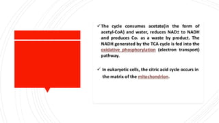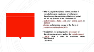 The document discusses the citric acid cycle (TCA cycle), including its key reactions catalyzed by enzymes like aconitase, isocitrate dehydrogenase, and succinyl-CoA synthetase. It also covers the significance of the TCA cycle in generating energy through the oxidation of acetyl-CoA derived from carbohydrates, fats, and proteins. The cycle is described as being a crucial metabolic pathway that unifies various biochemical pathways.