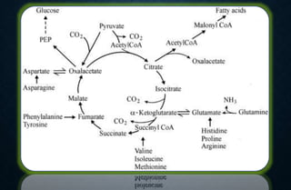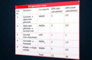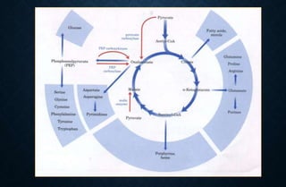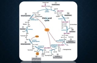 The document discusses the citric acid (TCA) cycle, which occurs in the mitochondria and involves 8 steps to completely oxidize acetyl-CoA derived from carbohydrates, fats, and proteins, producing carbon dioxide and reducing equivalents in the form of NADH and FADH2. These reducing equivalents are used to generate ATP through oxidative phosphorylation. The TCA cycle also serves as a hub to integrate various metabolic pathways and provides precursors for many biosynthetic processes. Regulation of the cycle occurs through feedback inhibition by products of high energy states like ATP and NADH.