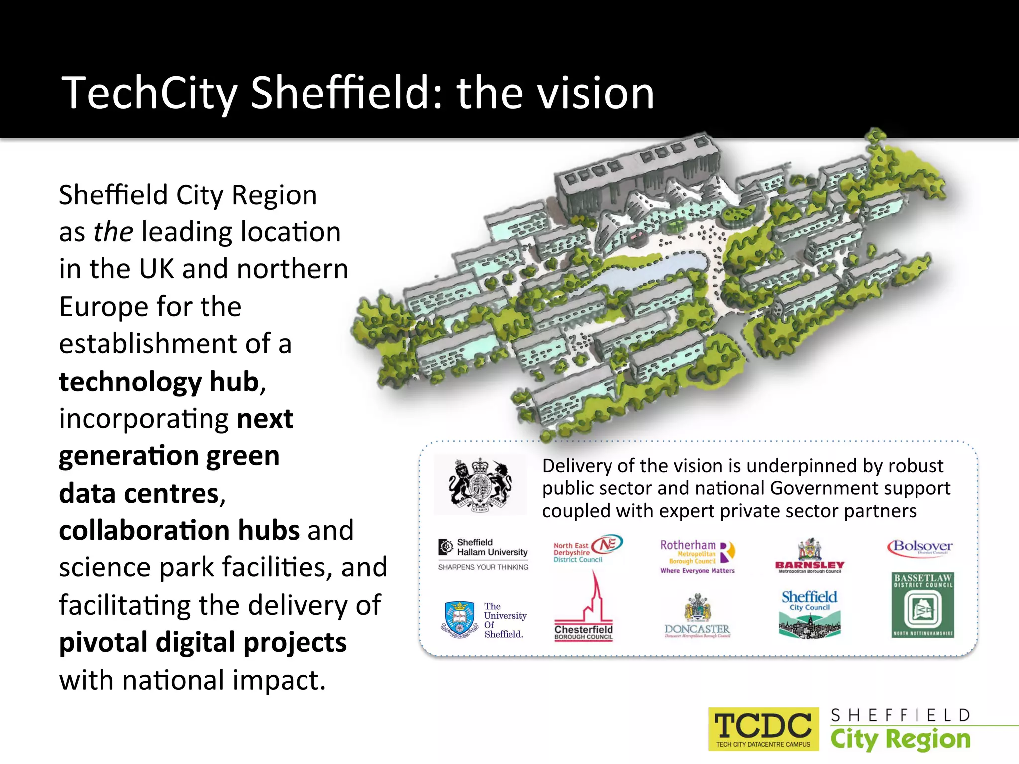 This document outlines a vision to establish the Sheffield City Region in the UK as a hub for next-generation data center capacity and digital innovation. It proposes developing a premier data center campus, collaboration hubs, and facilitating pivotal digital projects. A consortium including the local government, private sector experts, and construction companies would work with national government to support this plan by developing infrastructure and attracting inward investment to the region. The document argues that the Sheffield City Region is an ideal location for data centers due to available land, existing power infrastructure, fiber networks, climate, and support for green energy development.