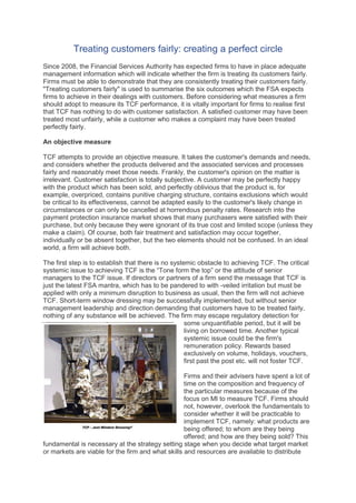 The document discusses the concept of 'treating customers fairly' (TCF) in the financial services sector, emphasizing that TCF is distinct from customer satisfaction. It outlines the importance of management commitment, appropriate product offerings, and staff competence in achieving TCF outcomes, which focus on fair customer treatment and transparent communication. The text also highlights various measures firms can adopt to assess and ensure compliance with TCF principles.