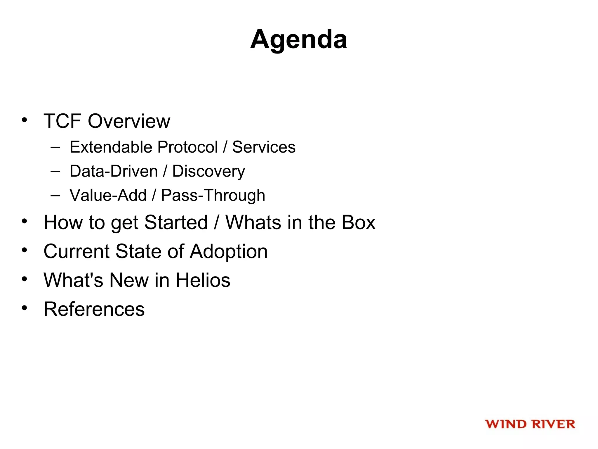The document discusses updates to the Target Communication Framework (TCF) in Helios. TCF is an open standard protocol that enables communication between debugging tools and embedded targets. The updates include support for streaming and zero-copy binary transfer, dynamic loading of services, a debug server value-add, and SSL connections. The document also provides an overview of TCF design goals and architecture, current adoption status, and plans for the future.