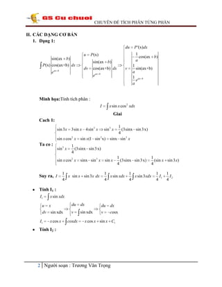 Tài liệu trình bày về tích phân từng phần với công thức và phương pháp cụ thể. Nó bao gồm các dạng cơ bản, ứng dụng, bài tập minh họa và chú ý khi chọn hàm u, v. Tài liệu được biên soạn bởi Trương Văn Trọng.