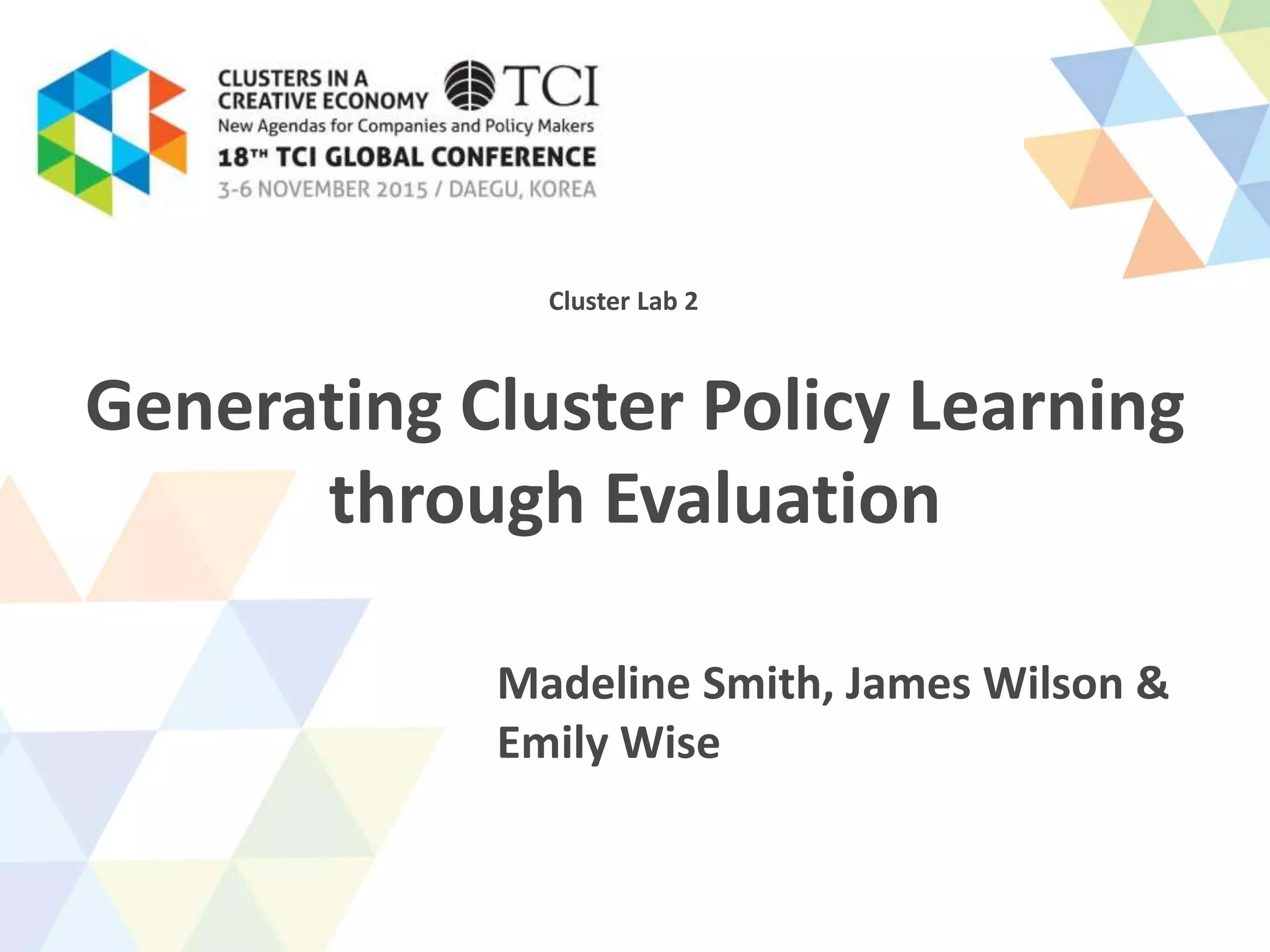 The document discusses the challenges and progress in cluster policy evaluation, highlighting the importance of collaborative learning and sharing experiences among stakeholders. It emphasizes the need for improved methodologies to capture the impact of cluster policies, addressing issues such as intangible outcomes and the complexity of policy mixes. The document aims to foster discussions on effective evaluation practices that enhance trust, social capital, and actionable insights for policymakers.