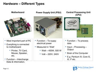 This document provides an overview of computer hardware components and how to build a PC. It defines hardware as the physical parts of a computer including the motherboard, CPU, RAM, graphics card, hard disk, DVD drive, power supply, case, keyboard, mouse and monitor. It then describes the functions of these core components and how they interconnect. The document concludes by outlining the step-by-step process for assembling these hardware parts into a fully functioning computer system, including installing the CPU and RAM into the motherboard, adding the graphics card, connecting power supplies, and setting up input/output devices.