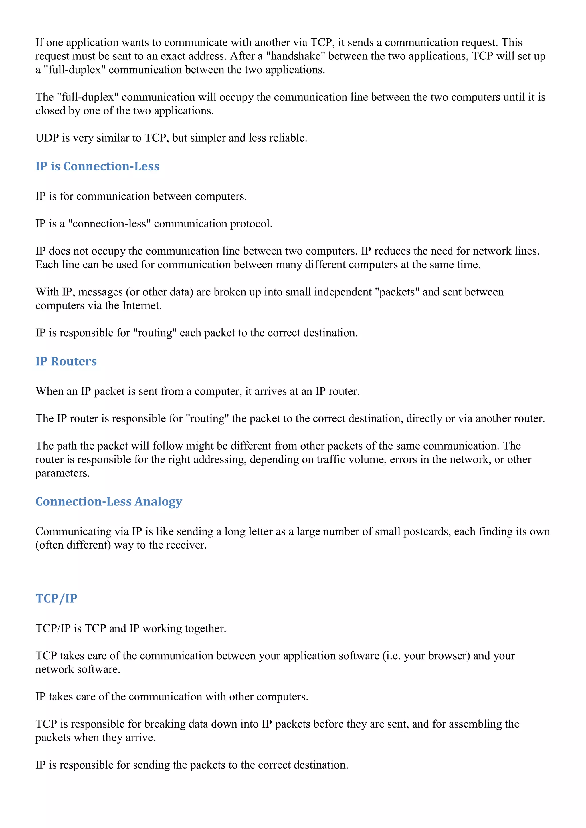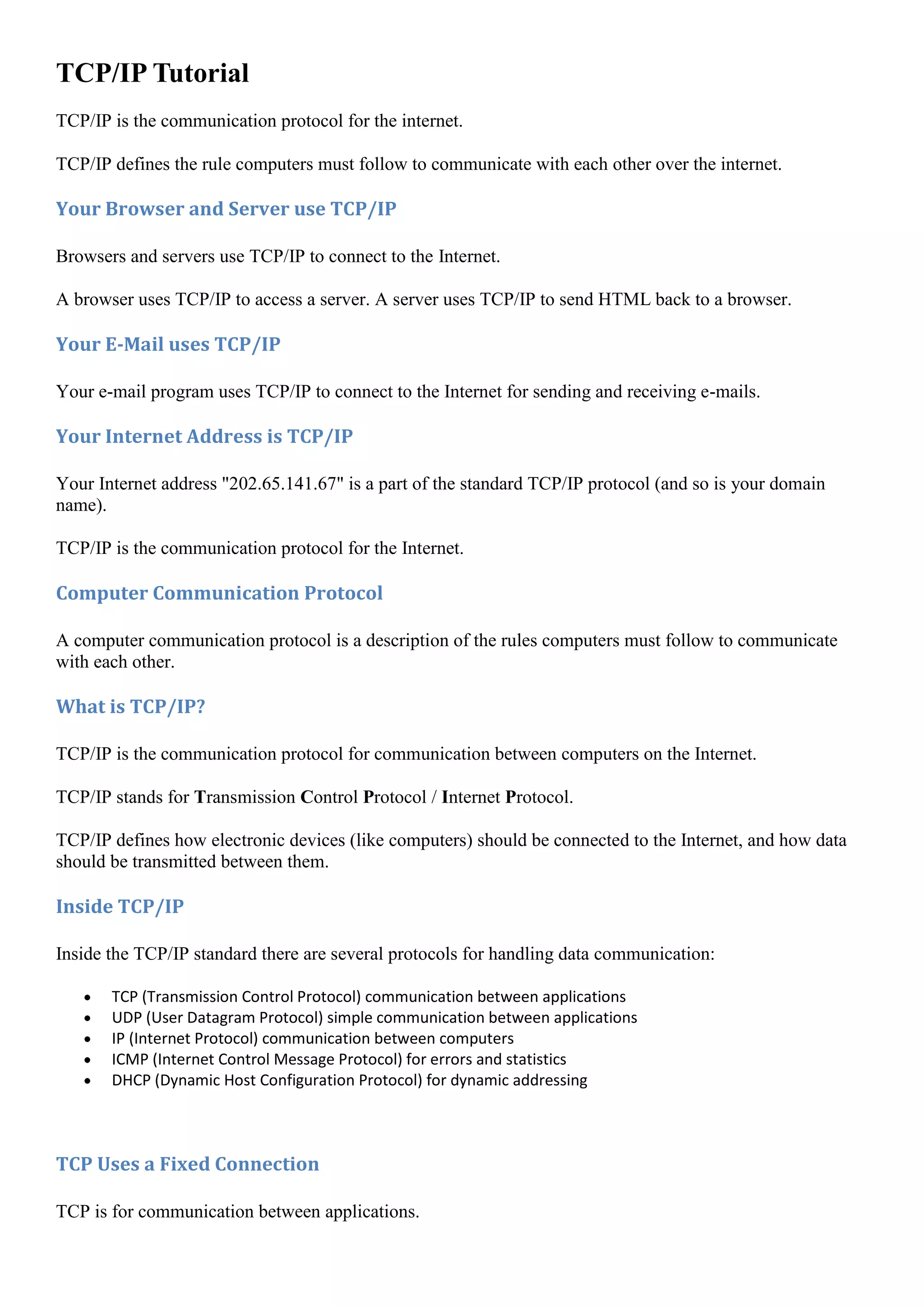 TCP/IP is the communication protocol for the Internet that defines rules for how computers communicate. It includes several protocols like TCP, UDP, IP, and ICMP. TCP/IP uses IP addresses and domain names to identify devices. It allows browsers to access servers, email programs to send and receive messages, and other Internet functions. TCP/IP is essential for electronic devices to connect and exchange data over the Internet.
