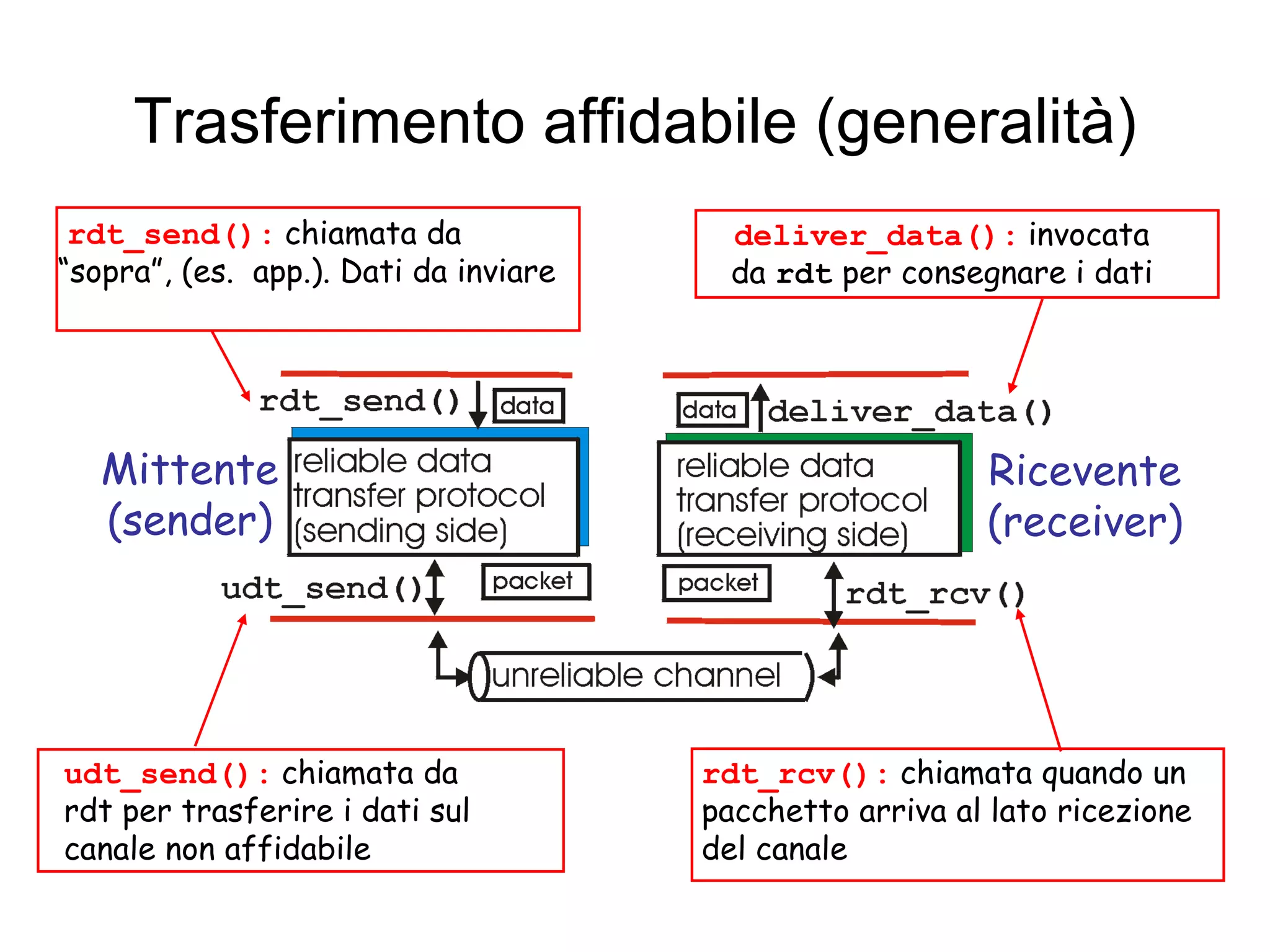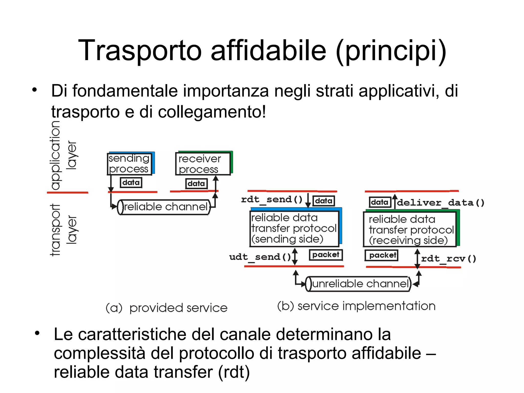 Il documento descrive i principi del trasporto affidabile nei protocolli di comunicazione, evidenziando la complessità dovuta alle caratteristiche del canale e alle gestioni degli errori tramite meccanismi come acknowledgement e negative acknowledgement. Vengono presentati vari protocolli di trasferimento dati come rdt1.0, rdt2.0, e tcp, con le loro funzionalità e limitazioni, in particolare sui problemi di perdita e duplicazione dei pacchetti. Infine, viene affrontato il controllo della congestione in tcp, delineando fasi come slow start e congestion avoidance in risposta alle sue sfide.
