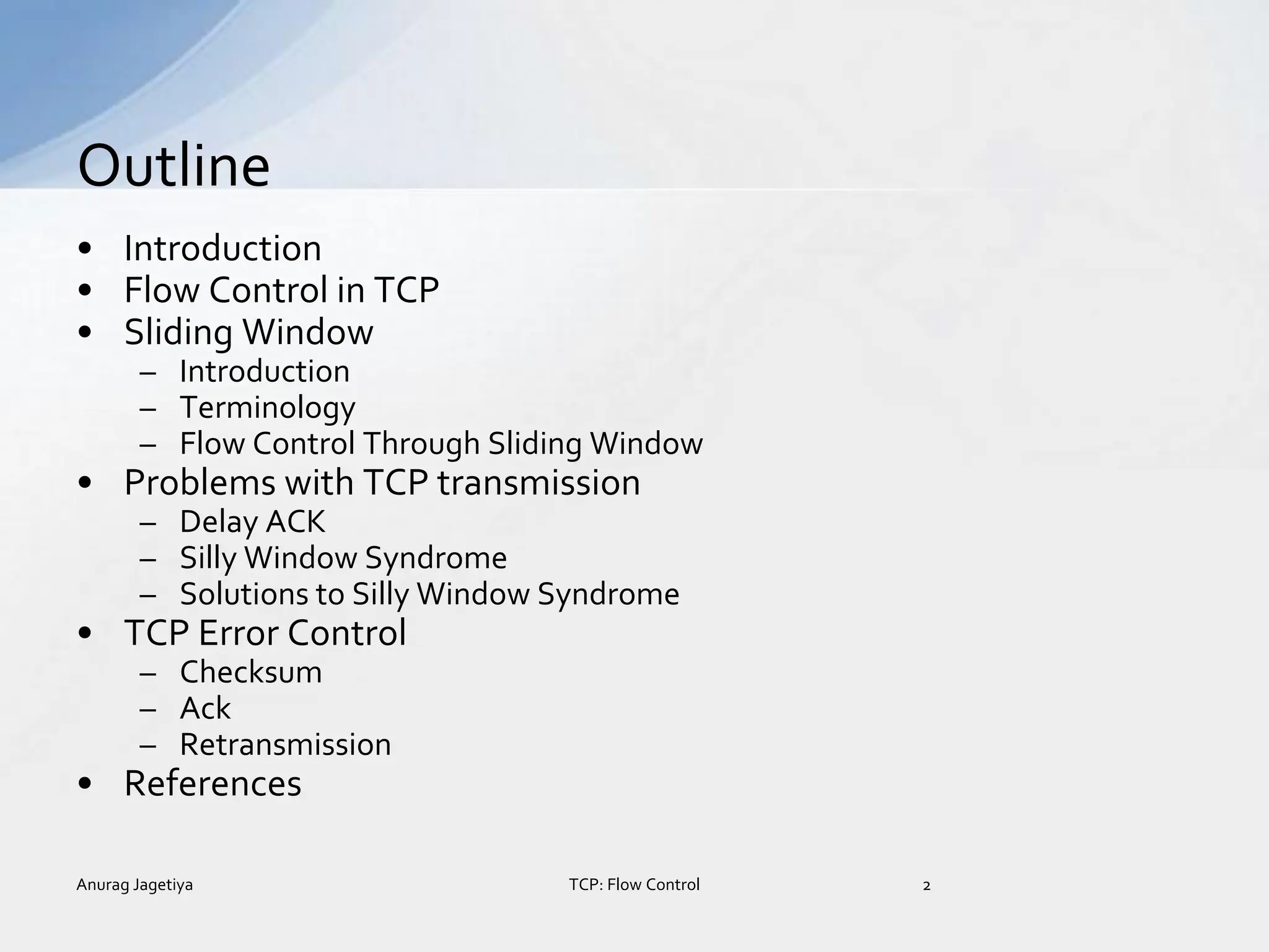 The document discusses flow control in TCP. It explains that TCP uses a sliding window mechanism for flow control to balance the sender's transmission rate with the receiver's reception rate. The size of the sliding window is determined by the receiver's advertised window size and the congestion window size. TCP provides reliable, in-order delivery of data segments through error control methods like checksums, acknowledgements, and retransmissions. It also addresses problems like delayed ACKs, silly window syndrome, and solutions to improve TCP transmission efficiency.