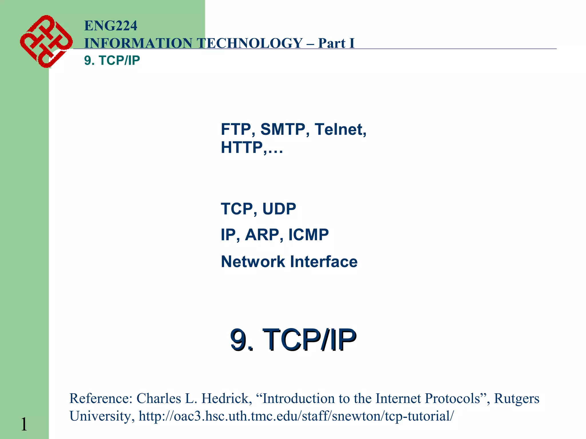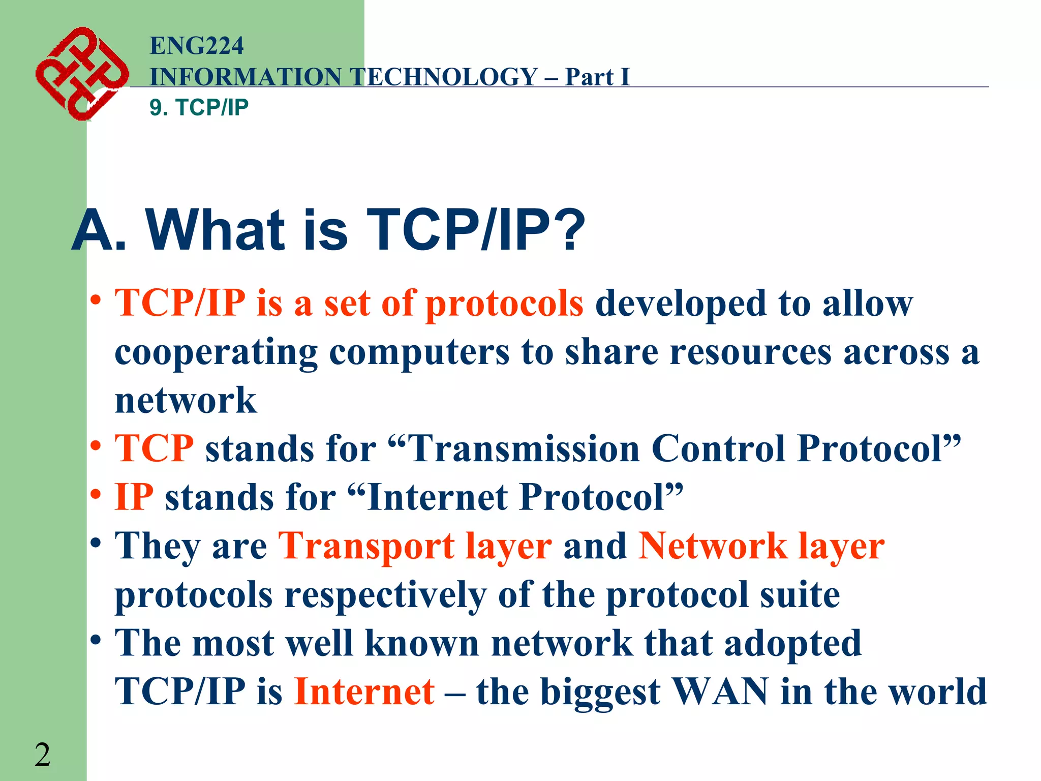 This document provides an overview of the TCP/IP protocol suite. It begins by defining what TCP/IP is, noting that it is a set of protocols that allow cooperating computers to share resources across a network. TCP/IP is made up of the TCP and IP protocols at the transport and network layers respectively. The document then discusses specific protocols at each layer, including application layer protocols like FTP, SMTP, and HTTP, as well as transport layer protocols TCP and UDP. It also covers network layer protocols like IP, ARP, and ICMP. The document concludes by discussing TCP/IP addressing schemes and how networks are divided into subnets.