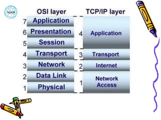 The document discusses the TCP/IP model and its layers. TCP/IP was created after the OSI 7 layer model for use on the Internet. It has four or five layers: Application, Transport, Internet, and Network Access layers. The Network Access layer can also be split into Physical and Data Link layers. Each layer of TCP/IP has specific functions, such as the Transport layer handling error detection and recovery, and the Internet layer using IP and ARP protocols.