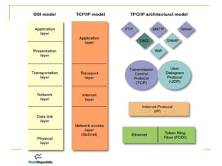 The TCP/IP model is composed of four layers: Application, Transport, Internet, and Network. The two most important protocols are TCP and IP, which operate at the Transport and Internet layers, respectively. TCP provides reliable data transmission with error checking and UDP provides a simpler transmission method without these checks. Common protocols like HTTP, SMTP, and TFTP reside at the Application layer and utilize either TCP or UDP depending on their reliability needs. The Network layer handles physical addressing and routing of data between devices using protocols like ARP, PPP, and Ethernet.