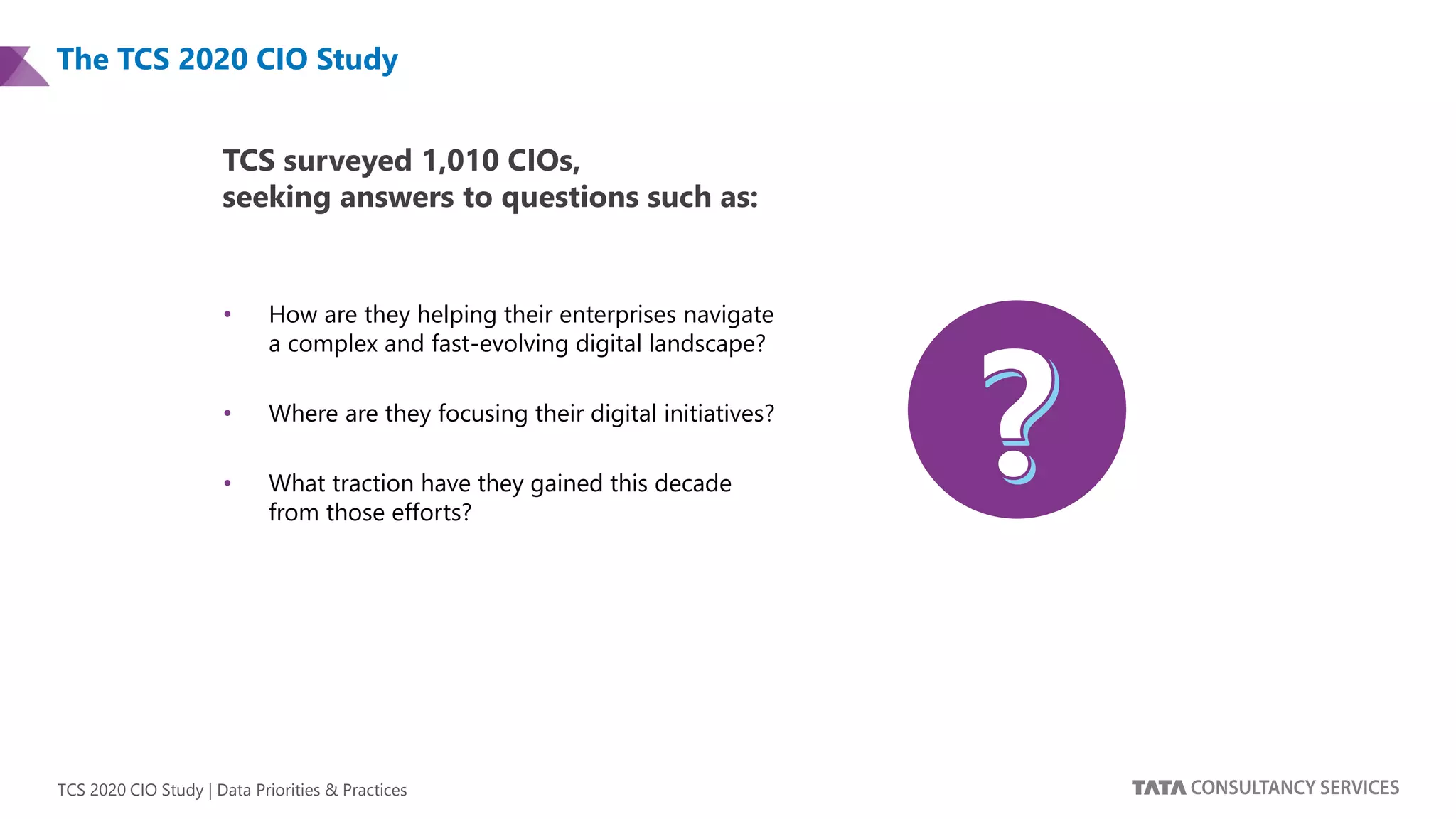 The TCS 2020 Chief Information Officer Study explores how CIOs navigate the evolving digital landscape, with insights from 1,010 CIOs across diverse industries. Key findings include the prioritization of data and analytics, security, and customer engagement, indicating differing levels of digital transformation success among leaders and followers. The study aims to highlight the strategies and outcomes of digital initiatives undertaken by CIOs to drive business transformation.