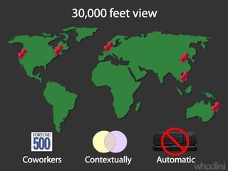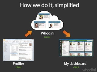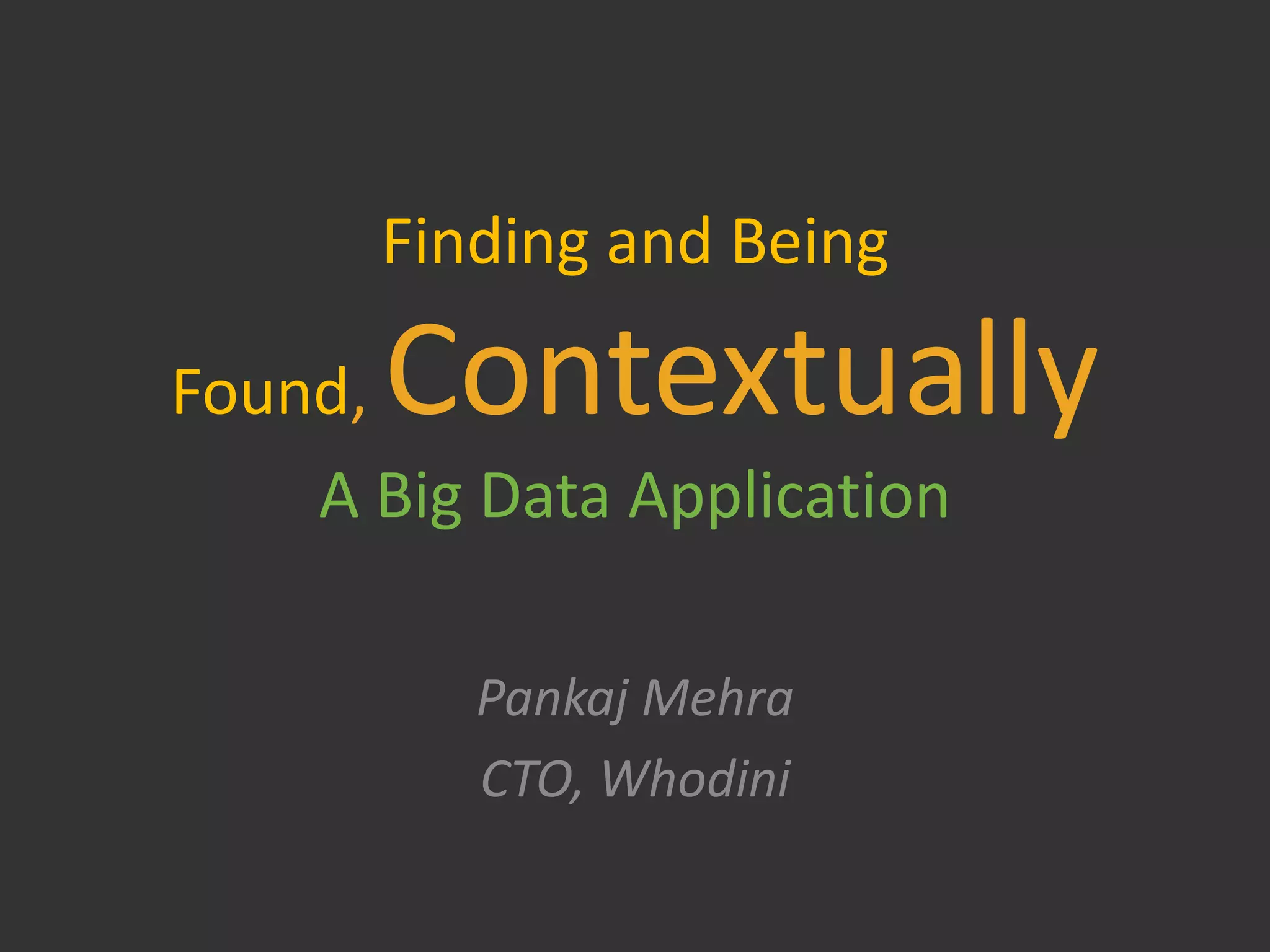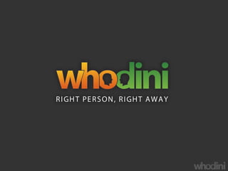 Whodini is developing context-aware computing technologies that will allow users to view and interact with the world through various information services mediated by context. Key innovations will include context-mediated transactions against persistent user-generated content. Whodini's technologies are organized along the temporal dimension and will provide maturity models for information management from operational visibility to exploitation and innovation.