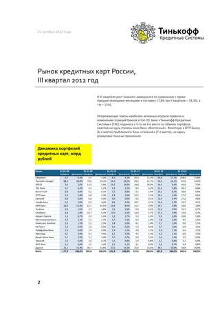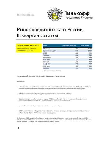 В III квартале 2012 года российский рынок кредитных карт вырос на 60,3% по сравнению с аналогичным периодом прошлого года, достигнув объема в 589,4 миллиарда рублей. Сбербанк укрепил свои позиции, увеличив портфель до 128,4 миллиарда рублей, в то время как 'Русский стандарт' и ВТБ24 теряют свою долю на рынке. Активные игроки, такие как ТКС банк и 'Связной', продолжают быстро расти, улучшая свои позиции в рейтинге крупнейших банков.