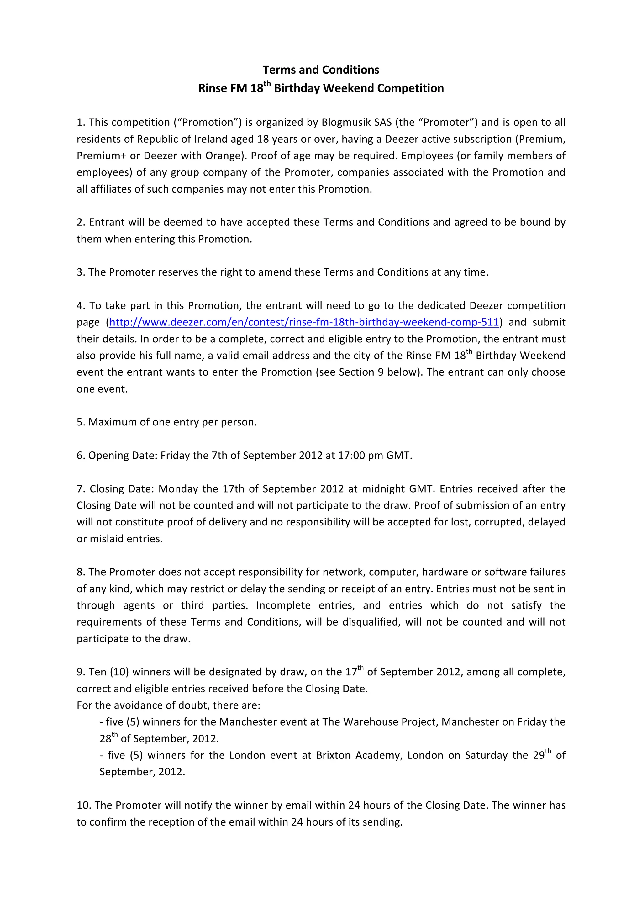 This document outlines the terms and conditions for a competition organized by Blogmusik SAS to win tickets to Rinse FM's 18th Birthday Weekend events in Manchester and London. The competition is open to Irish residents aged 18 or over with a Deezer subscription. Entrants must submit their details on the Deezer competition page between September 7-17, 2012 to be eligible. Ten winners will be selected by random draw to receive a pair of tickets worth £40 each to either the Manchester or London event.