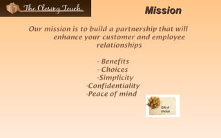 The document introduces gift collections from The Gift of Choice that allow the recipient to select their own gift within a designated budget and collection level. The collections range from $30 to $1000 and are designed to fit any occasion or lifestyle. Gifts can be ordered and delivered within 3 days and come with a 180-day satisfaction guarantee and no expiry dates on gift cards. The goal is to give the gift of choice and increase the perceived value of the gift for the recipient.