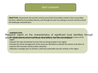The document outlines a plan to develop sustainable tourism in the Escornalbou Barony region of Catalonia, Spain. The objectives are to disseminate tourism throughout the year and surrounding areas. Activities included identifying landscape and cultural resources, evaluating tourism potential, and developing a strategic plan. Key resources identified included natural beauty, history, and agriculture. Potential tourism types are health, nature recreation, and farm tourism. A plan was created to improve attractions, create a unified identity and brand, develop promotional materials, and organize events to connect villages with the Escornalbou Castle, strengthening the regional tourism industry.