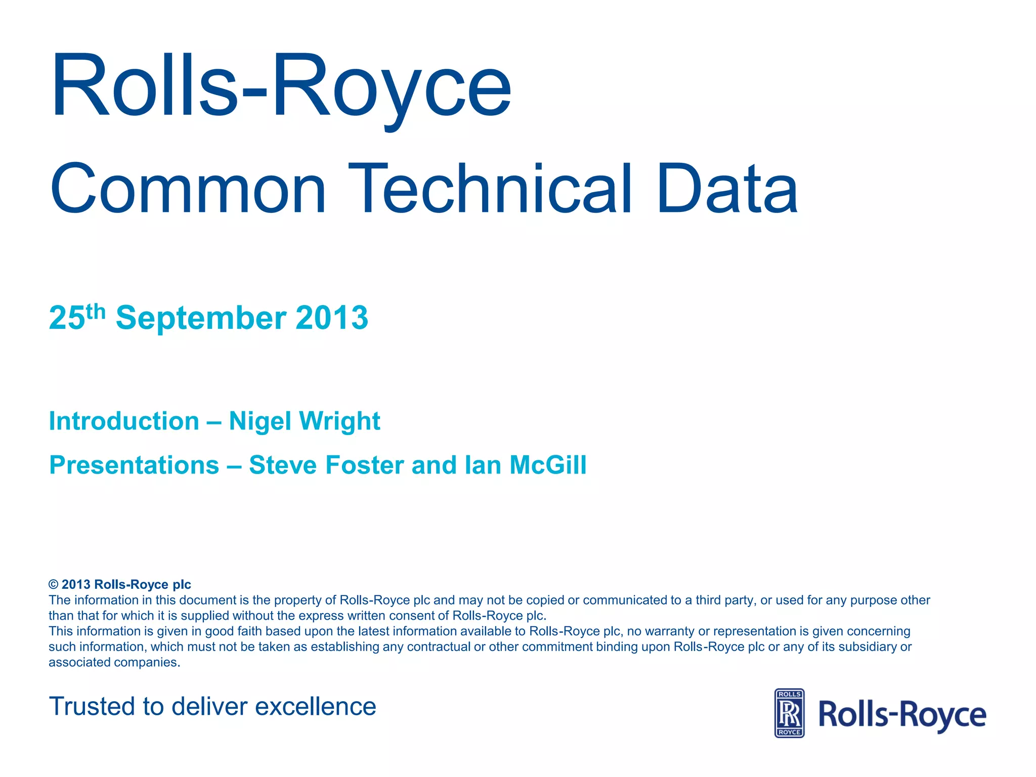 This document summarizes a Rolls-Royce presentation on technical publications and integrated production systems. It introduces Nigel Wright and Steve Foster who will discuss Rolls-Royce technical publications. It then describes how Rolls-Royce has moved from paper-based to electronic technical publications and data delivery using a system called PS2000. Finally, it discusses Ian McGill's upcoming presentation on Rolls-Royce's integrated production system which aims to create a seamless IT solution to support business operations.