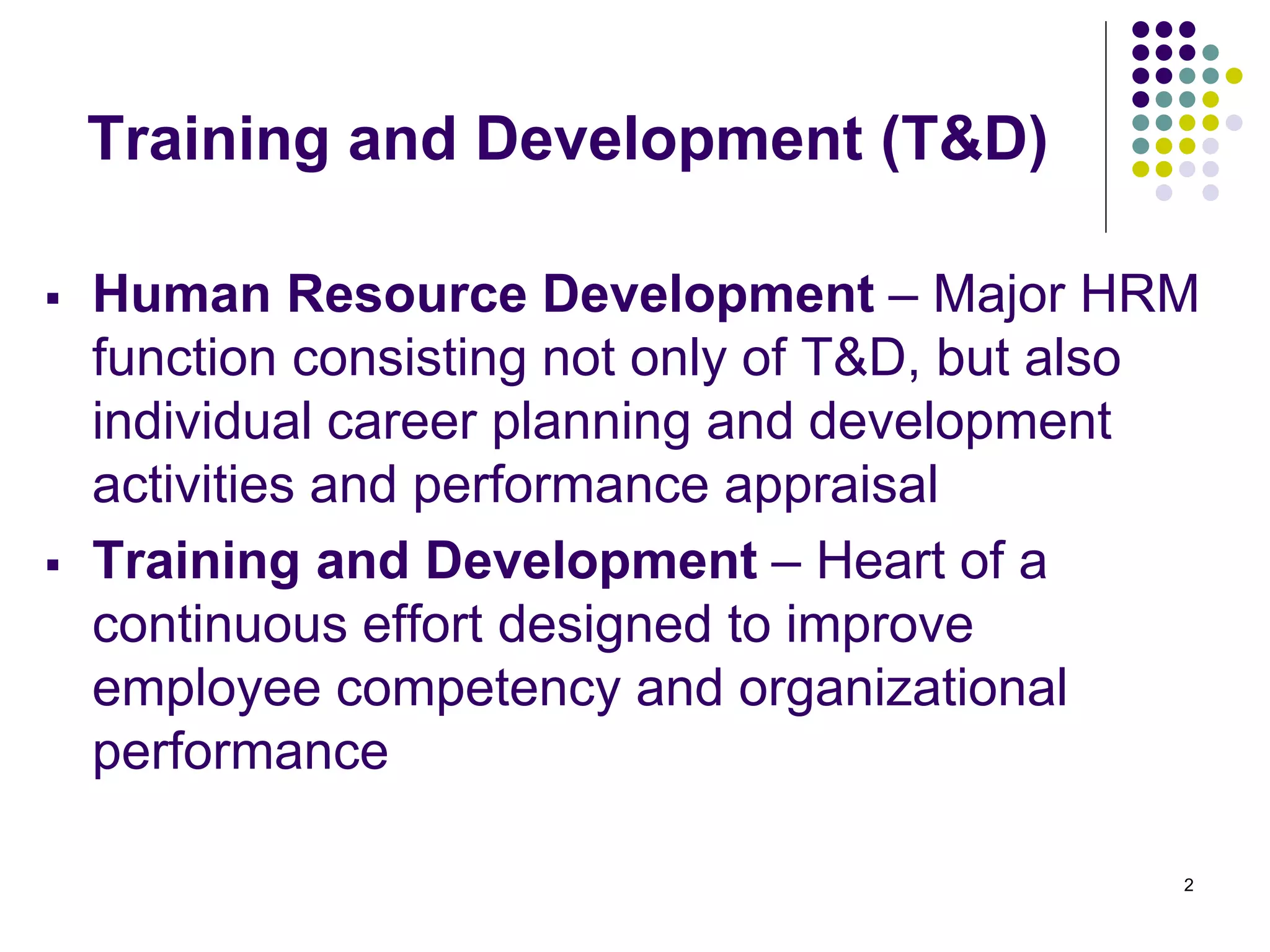 - T&D as a core human resource function, including training, development, and performance evaluation.