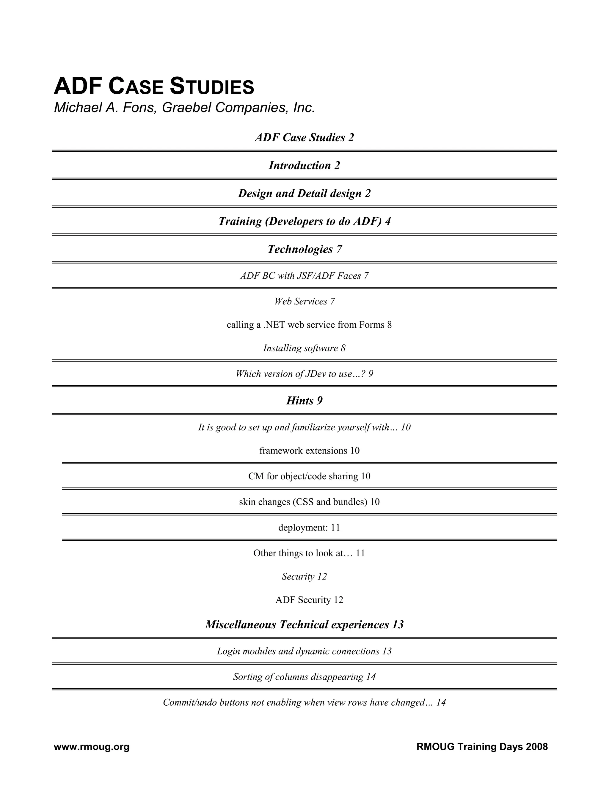 This document provides two case studies of projects using Oracle Application Development Framework (ADF). The first case study involves developing online day pages for an international moving company to schedule jobs. The second case study is developing a new website for RMOUG with member-only areas. The document discusses design considerations, training developers on ADF, implementing features like login authentication using database roles, and lessons learned around sticking closer to default ADF functionality.