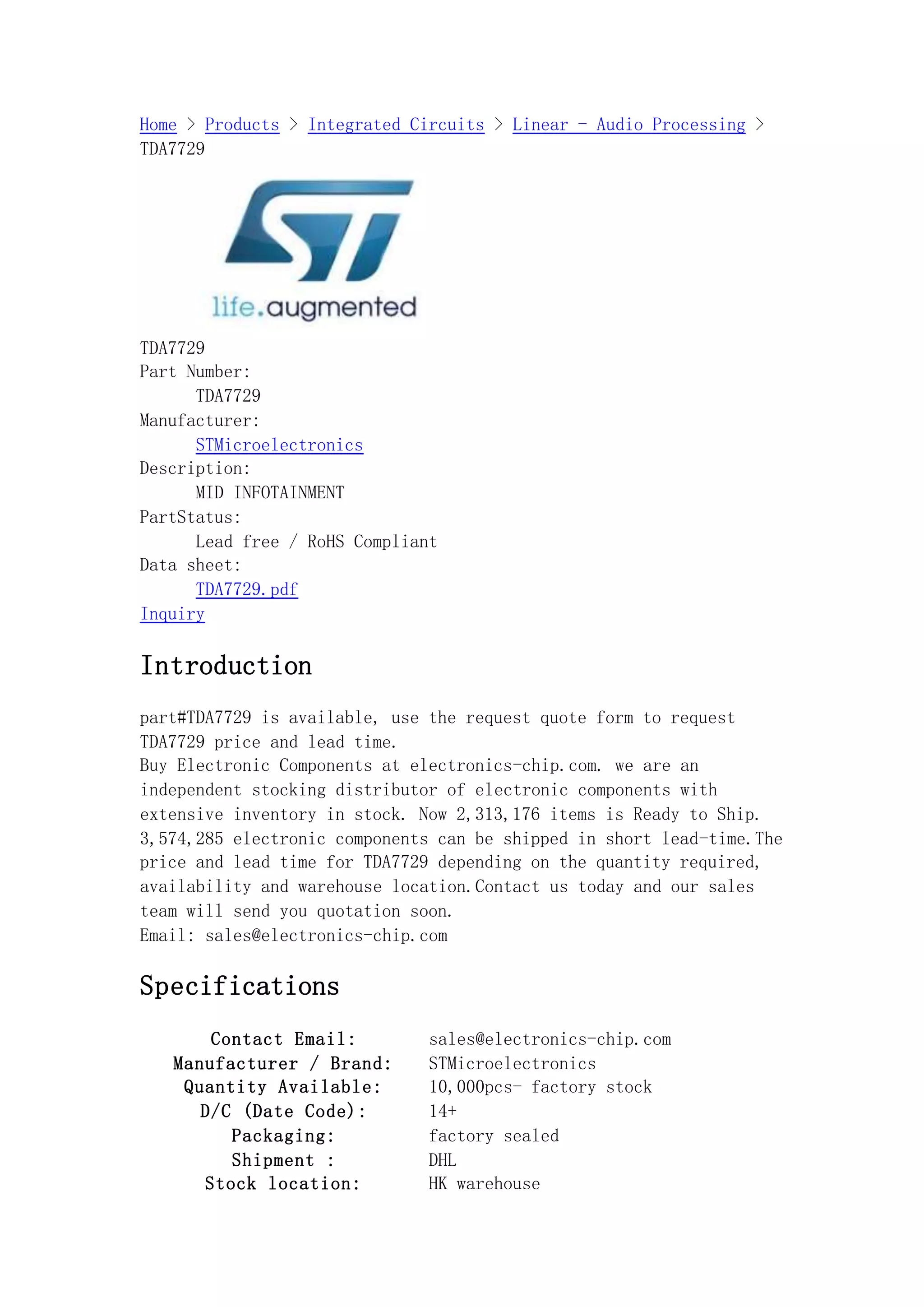 The TDA7729 is an audio processing integrated circuit manufactured by STMicroelectronics, available for purchase with a stock quantity of 10,000 pieces. Pricing and lead time can be obtained by requesting a quote from the distributor, electronics-chip.com. The document also contains related part numbers and links to additional information for electronic components.
