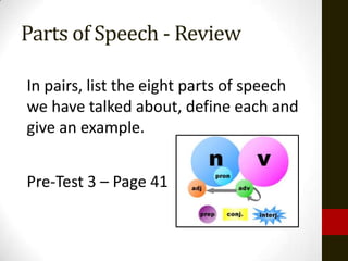 This document provides a review of parts of speech and grammar concepts. It includes exercises for students to practice identifying and using different parts of speech. The document also defines phrases, clauses, and sentences. It reviews adjective clauses in detail, including the uses of relative pronouns and restrictions on omitting pronouns. Modifiers before relative pronouns and reducing clauses to phrases are also discussed.