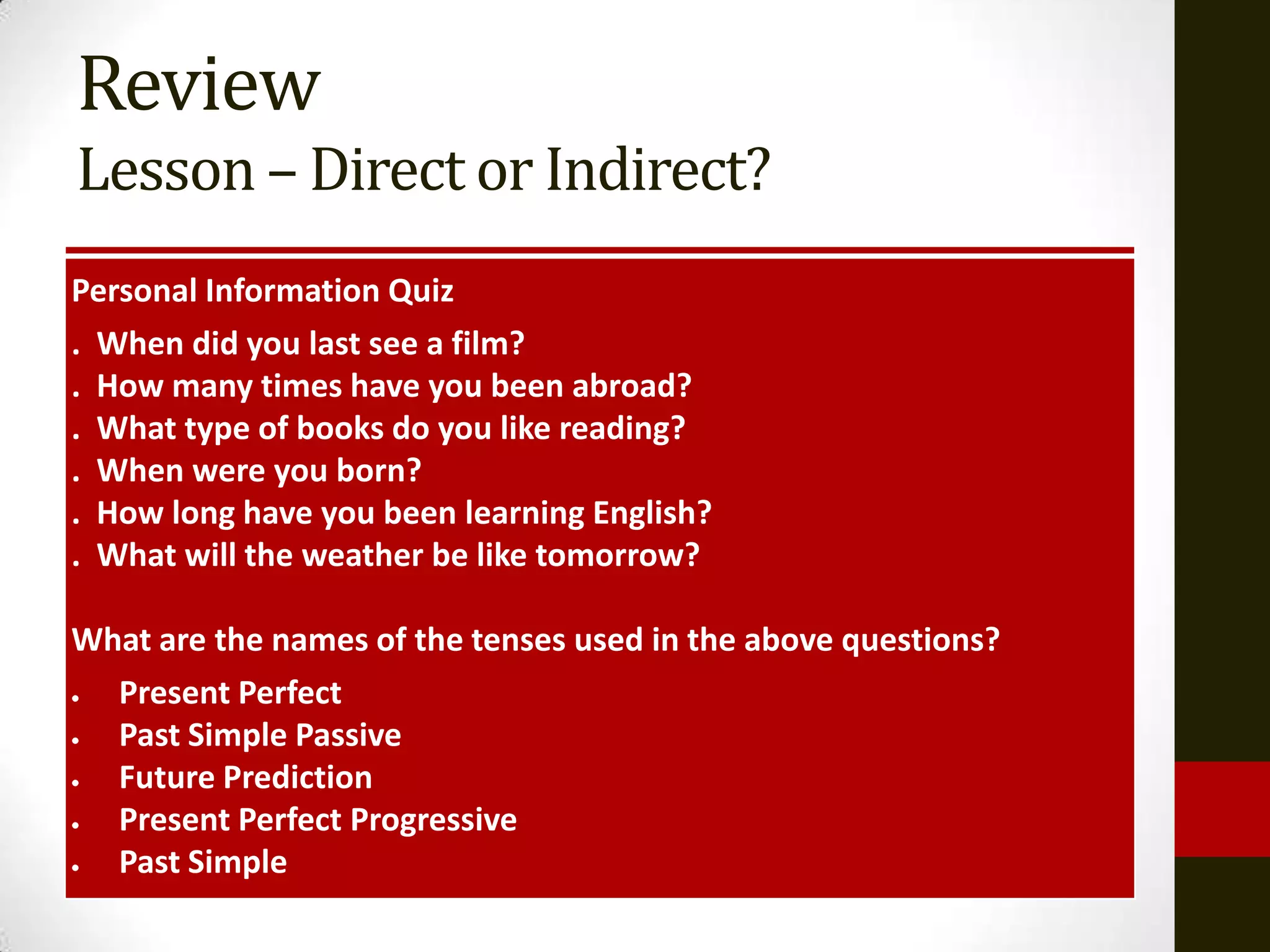 1) An activity where students take a personal information quiz in groups and identify the tenses used in the questions, such as present perfect, past simple, and future prediction.