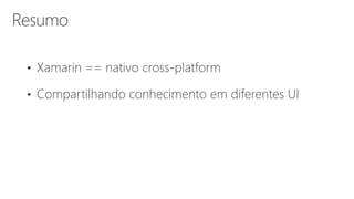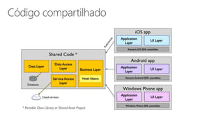 This document discusses using Xamarin to build mobile apps with C# that can run on iOS, Android, and Windows. It highlights that with Xamarin.Forms, developers can share more code across platforms, including shared UI code and a shared backend. It lists several .NET namespaces and platform-specific APIs that are available to Xamarin developers. The document promotes using C# and Xamarin to accelerate cross-platform mobile development for over 2.5 billion devices running iOS, Android, Windows, and Windows Phone.