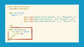 This document discusses Ruby enumerable methods beyond #each, including #all?, #partition, #select, #detect, #map, #group_by, and #include?. It encourages exploring these other enumerable methods and notes that the company Magnetis is hiring developers.