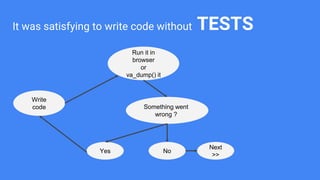 This document discusses the benefits of test-driven development (TDD) and unit testing over traditional approaches to coding without tests. It notes that coding without tests can lead to bugs that are difficult to fix and applications that are hard to update. TDD involves writing tests before production code to specify functionality, then writing just enough code to pass each test. This approach prevents bugs and ensures code quality and performance while improving maintainability. The key principle of TDD outlined is to not write any production code without a failing test first.