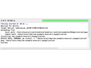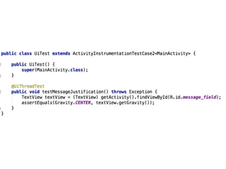 The document discusses Test-Driven Development (TDD) techniques in mobile software development, particularly for Android. It emphasizes the value of effective testing to deliver software faster and the need to distinguish between value-adding and wasteful coding activities. It also addresses challenges and provides examples to illustrate TDD principles and practices in the context of Android applications.