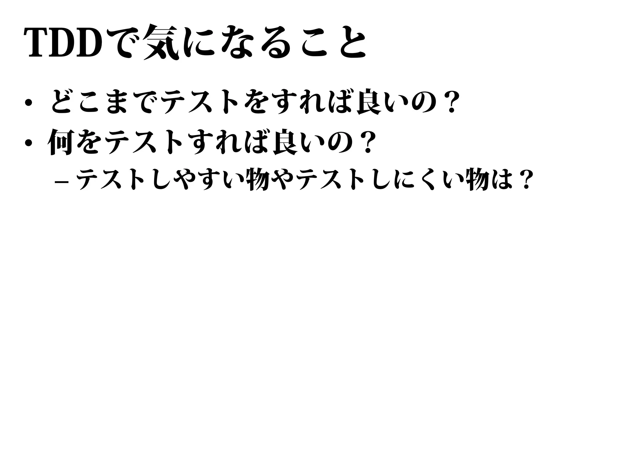 TDDで気になること • どこまでテストをすれば良いの? • 何をテストすれば良いの? –