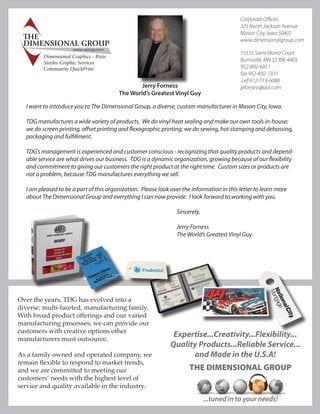 The Dimensional Group (TDG) is a diverse custom manufacturer located in Mason City, Iowa. Over the years, TDG has acquired several companies and integrated their manufacturing processes, allowing it to offer a wide variety of products and services from a single source, including screen printing, offset printing, heat sealing, sewing, die cutting, lamination, and fulfillment. TDG prides itself on its flexibility and commitment to meeting customer needs with high quality products and reliable service.