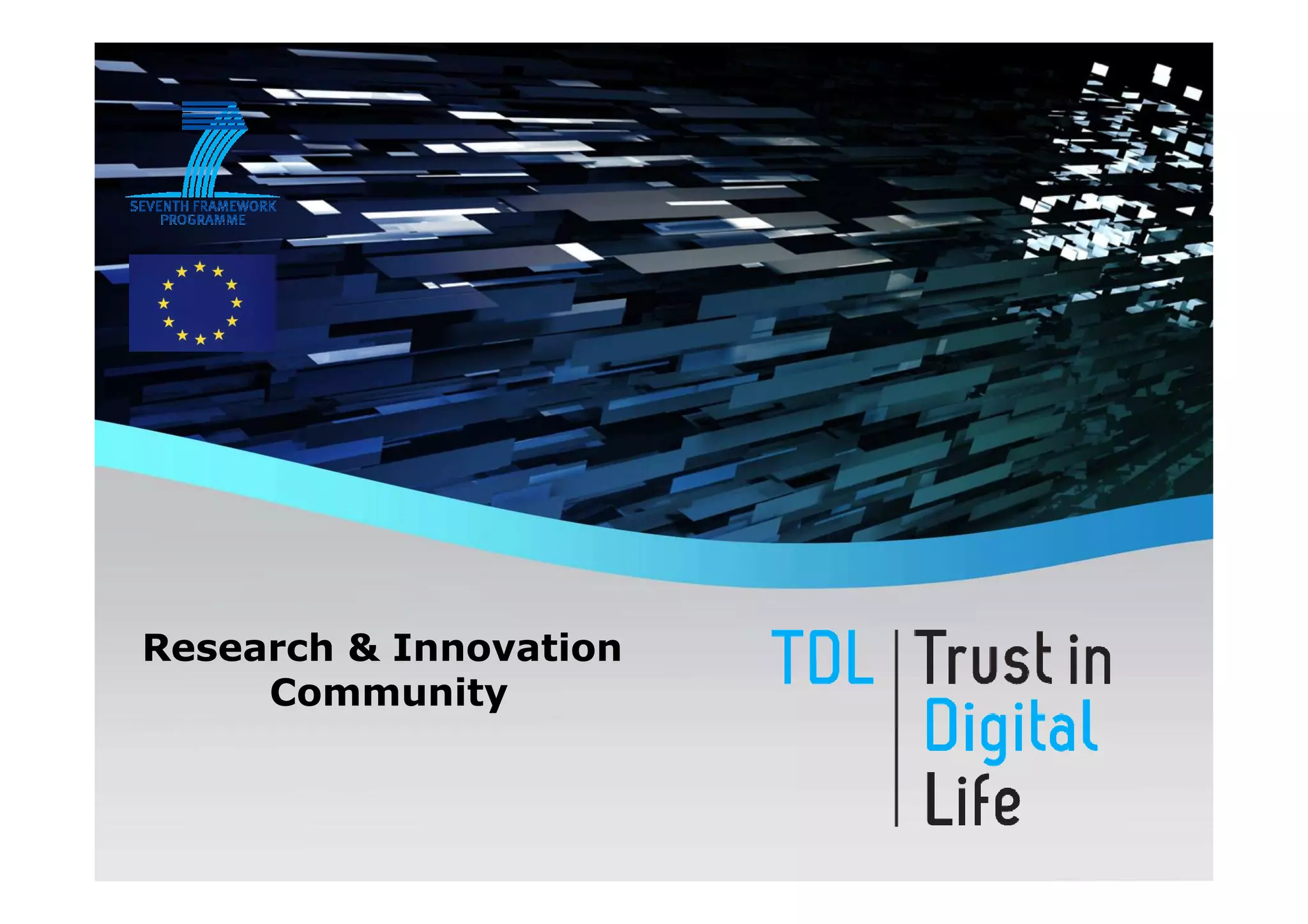 The document discusses the Trust in Digital Life (TDL) consortium, which aims to stimulate research and development of trustworthy information and communication technology (ICT) solutions. TDL has over 20 members from industry, academia, and government working to set a research agenda. The consortium's goals are to establish an inspiring and self-sustaining community to advance knowledge and collaborative projects, develop an innovative research agenda, enable public funding for related projects, and increase awareness through demonstrations. TDL will measure progress using key performance indicators like adoption rates of e-services and survey scores on consumer trust.