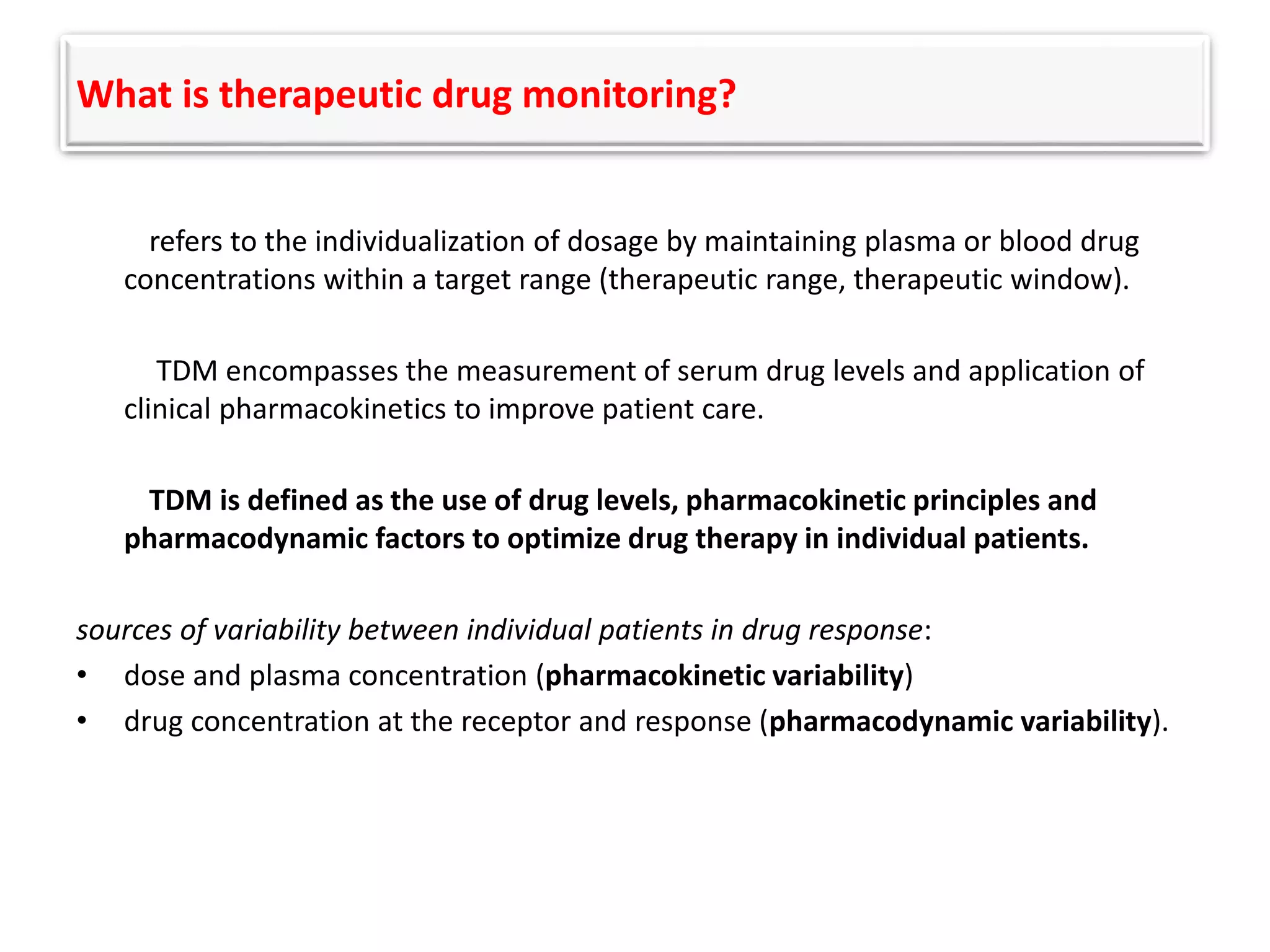 Therapeutic drug monitoring refers to maintaining drug concentrations within a target range by individualizing dosages. It involves measuring serum drug levels and applying pharmacokinetic principles to optimize drug therapy for each patient. Therapeutic drug monitoring is helpful for drugs with marked variability, concentration-dependent effects, a narrow therapeutic index, or when the desired therapeutic effect is difficult to monitor. Commonly monitored drugs include aminoglycosides, antiepileptics, cardioactives, and lithium.